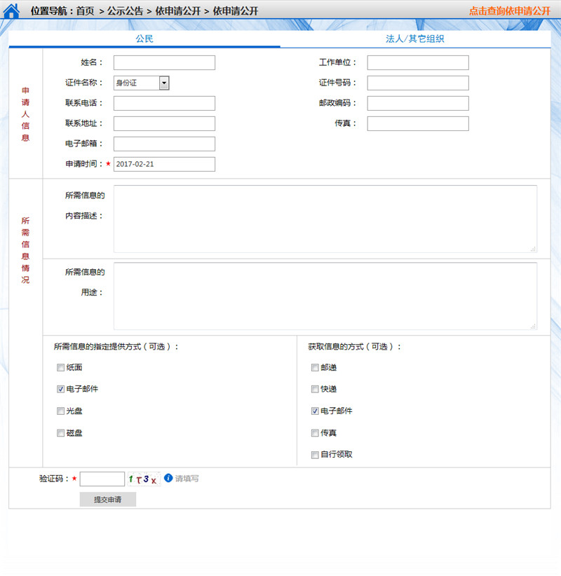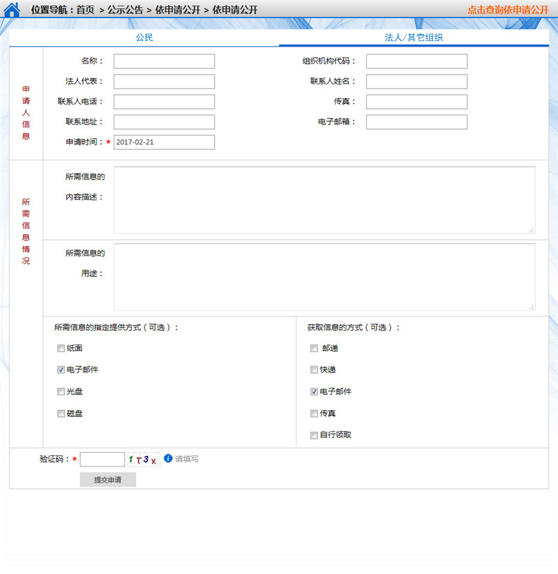 依申請公開功能,就是行政機關(guān)根據(jù)公民、法人或者其他組織的申請,依照法律規(guī)定和本機關(guān)的職權(quán),向申請人公開政府信息的行政行為。政府信息量大面廣,涉及社會生產(chǎn)生活各個方面,其中有相當一部分信息只涉及部分人和事,只對特定的公民、法人和其他組織從事生產(chǎn)、安排生活、開展科研等活動具有特殊的作用。為了保證公民、法人或者其他組織獲取所需要的政府信息,依照相關(guān)規(guī)定除行政機關(guān)主動公開的政府信息外,公民、法人或者其他組織還可以根據(jù)自身生產(chǎn)、生活、科研等特殊需要,向國務(wù)院部門、地方各級人民政府及縣級以上地方人民政府部門申請獲取相關(guān)政府信息。